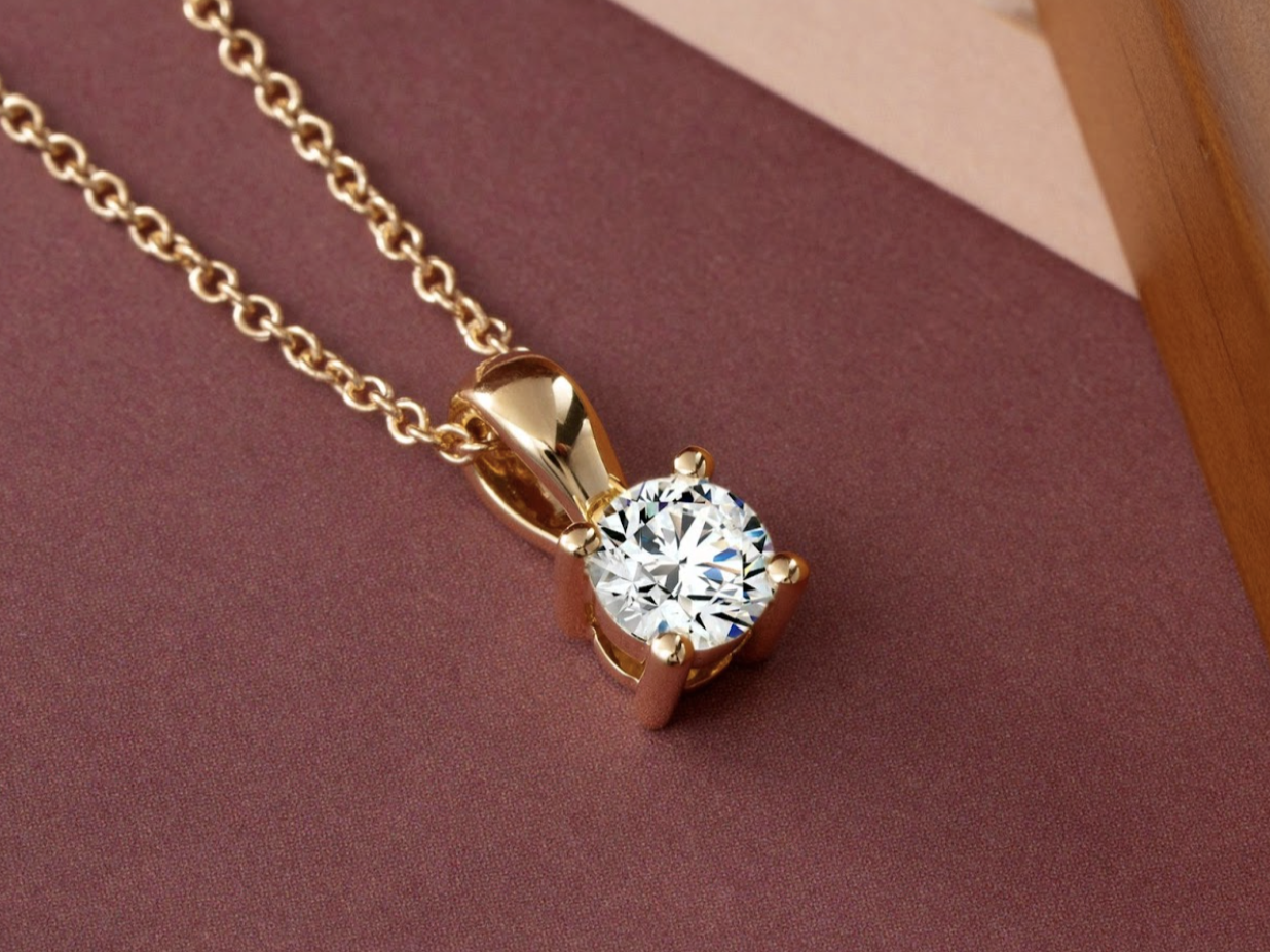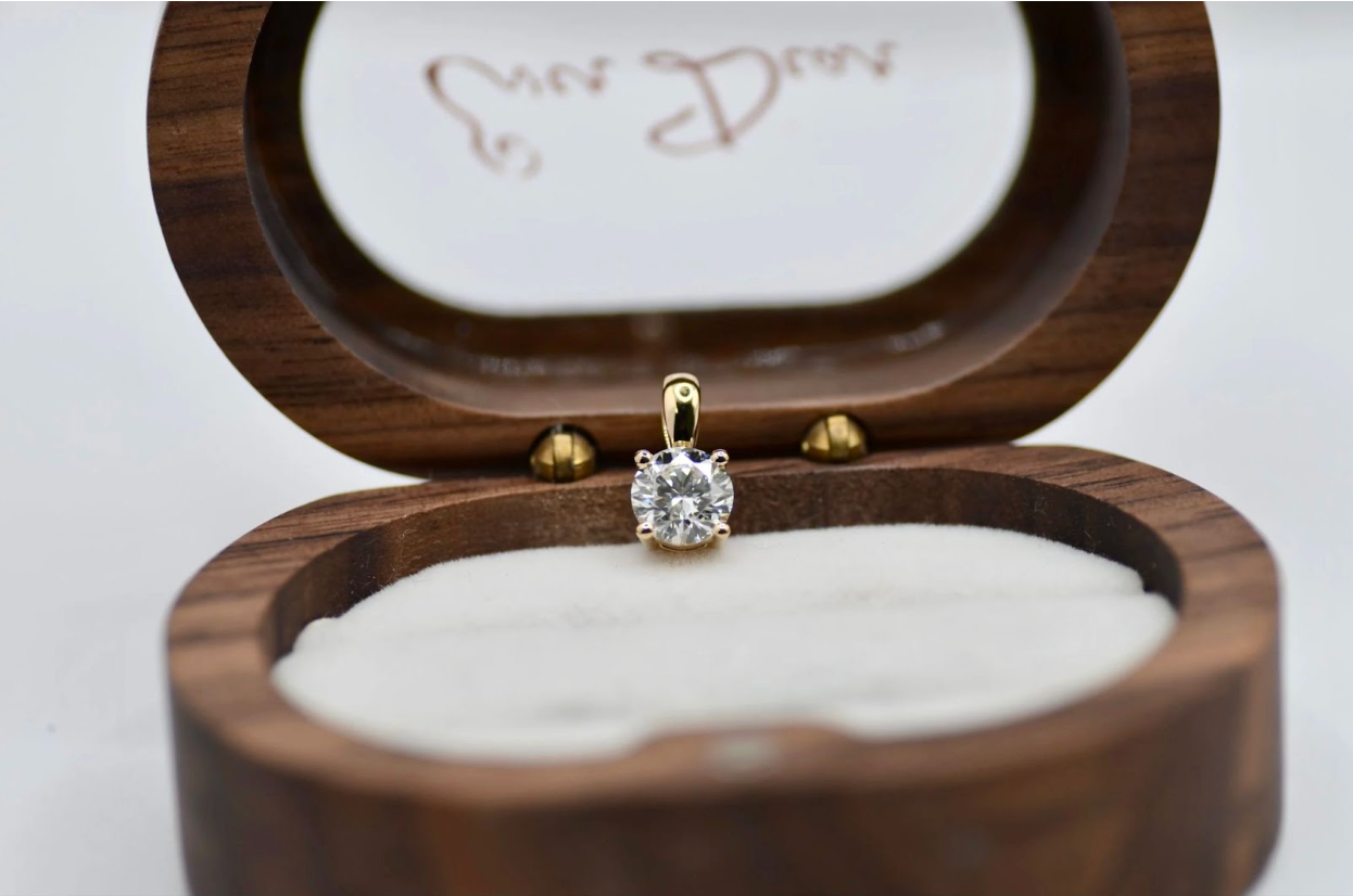 Schließlich wird der Diamant in das gewählte Schmuckstück eingesetzt. In Rezas Fall bedeutete dies die Anfertigung eines klassischen Anhängerdesigns aus 18 Karat Gold, gefertigt für Langlebigkeit und angenehmen Tragekomfort im Alltag.